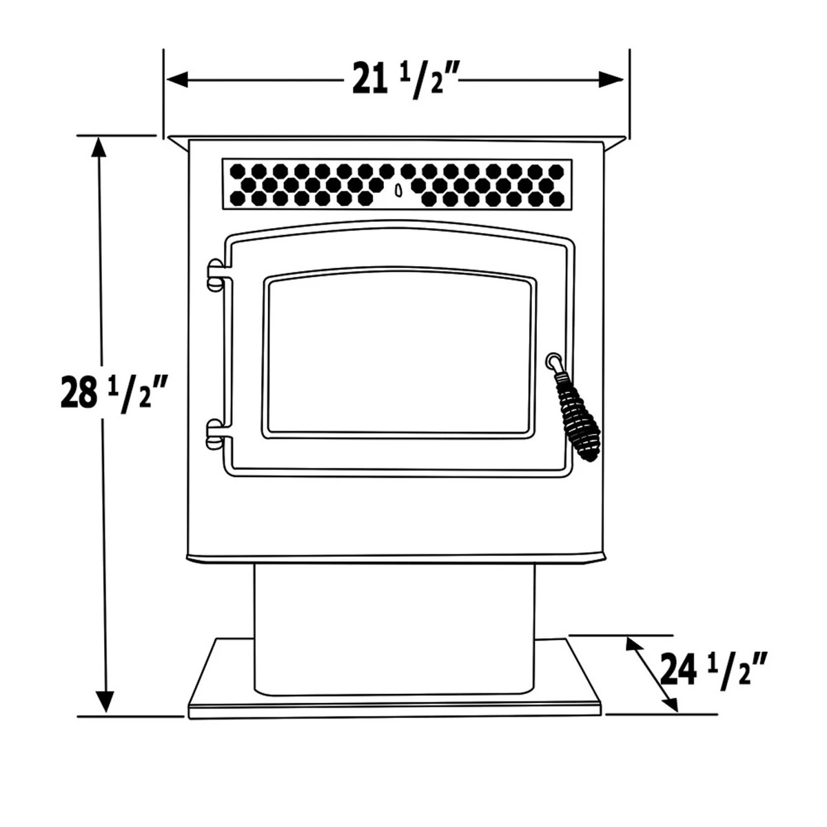 - Pellet Stove dimensions: 21.5″ Wide x 28.5″ High x 24.5″ Deep