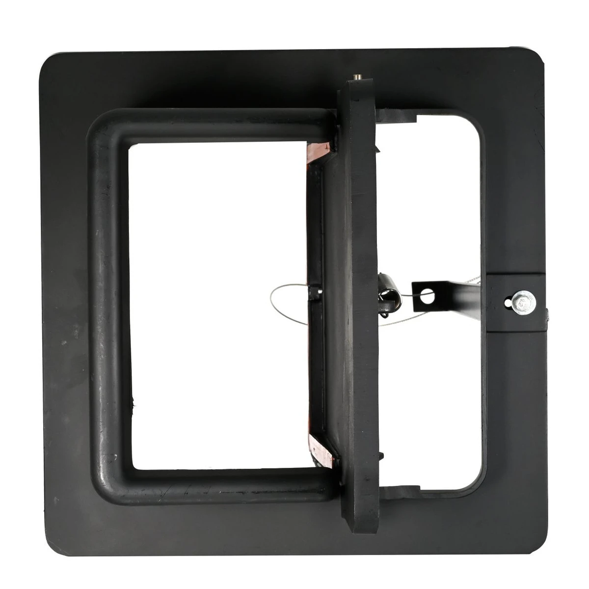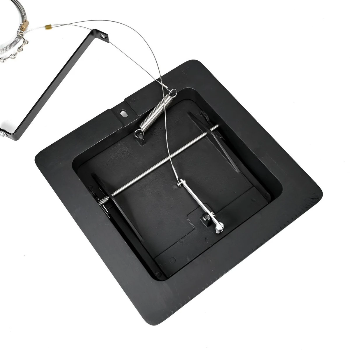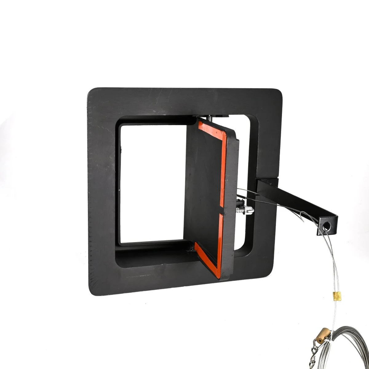 The Lyemance Damper can be installed in minutes and comes with a tube of silicone adhesive for mounting to the top of the tile liner. The lid of the damper is spring-loaded and normally in the open position. It is shut by means of a stainless steel cable which extends down the inside of the chimney flue and is attached to a hook mounted in the fireplace opening. Each die cast aluminum damper is completely assembled and includes a 32′ cable. Longer cables are available.