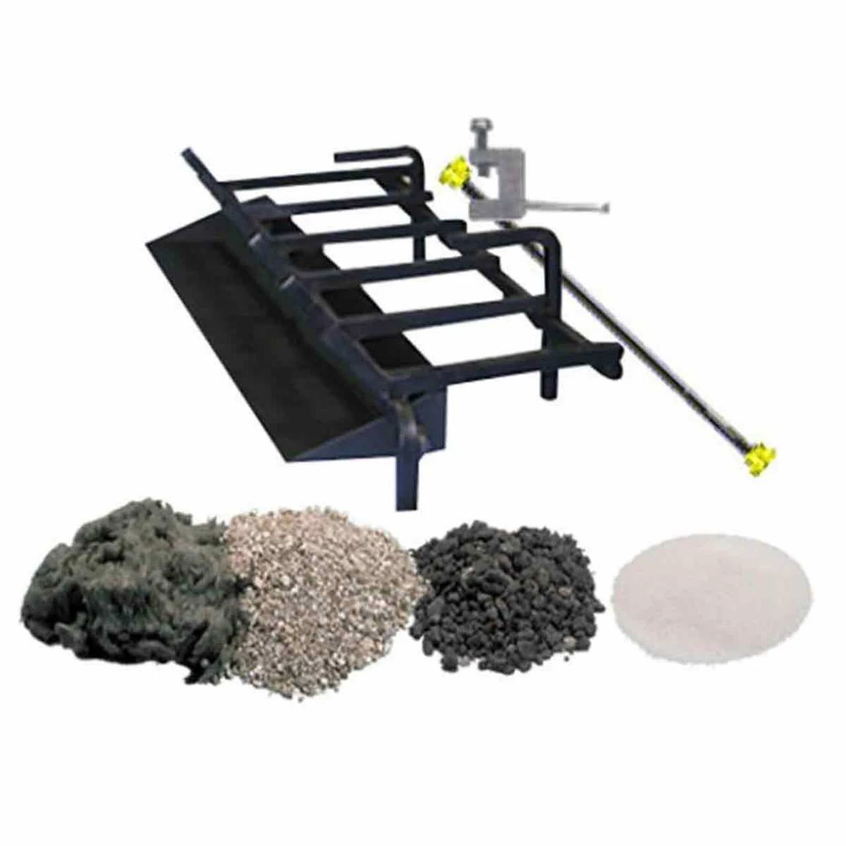Burner set includes a pedestal grate, burner, decorative silica sand, volcanic cinders, dual effect embers, ember tray, damper stop, and aluminum connector for installation to a 1/2″ natural gas line. All gas valves are sold separately.