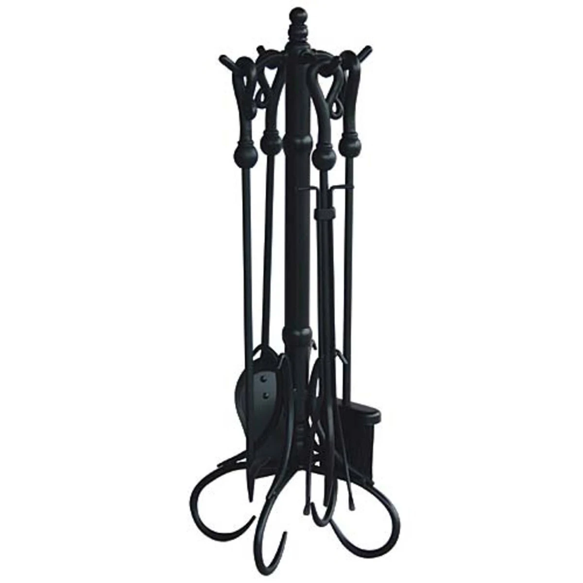 All the features you look for in a quality black fireplace tool set are offered in this five-piece set. Each piece is made of wrought iron for strength and durability and has a fine powder-coat finish for beauty that will last a lifetime. When quality is your first priority, this is the perfect fireplace tool set for you! Set includes a shovel, poker, tongs, a brush and tool stand. Measures 30″ High.