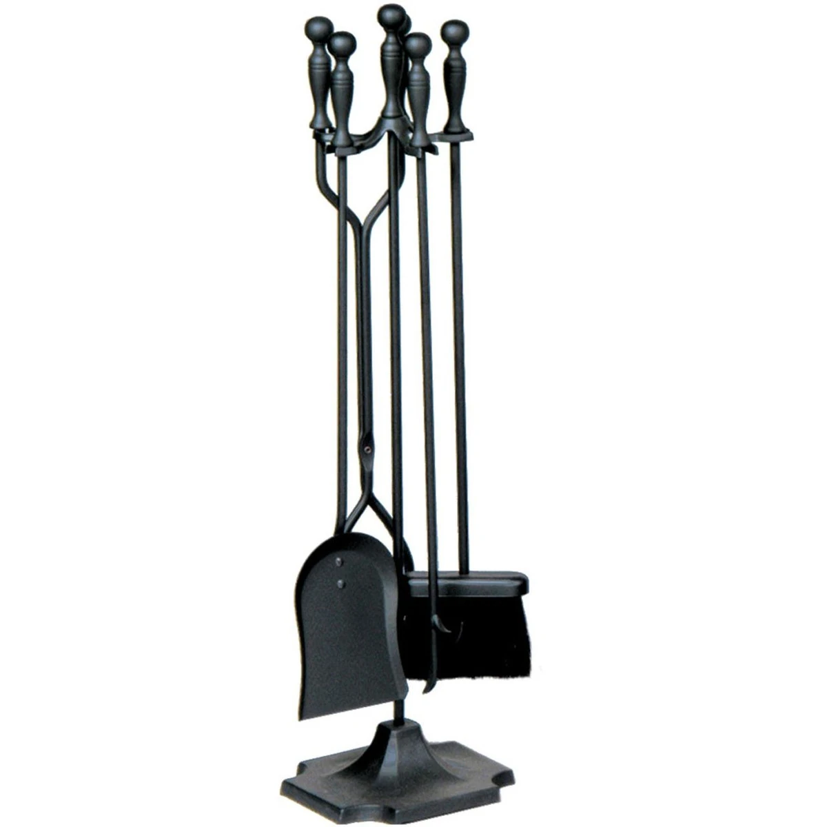 Enhance the look and feel of your fireplace with this 5 Piece Black Fireset. The unique fireplace tool set is designed not to take up much space and fits nicely near any fireplace or on any hearth. The easy grip handles makes cleaning and organizing your fire stress free! Tool set includes 4 tools and a stand.