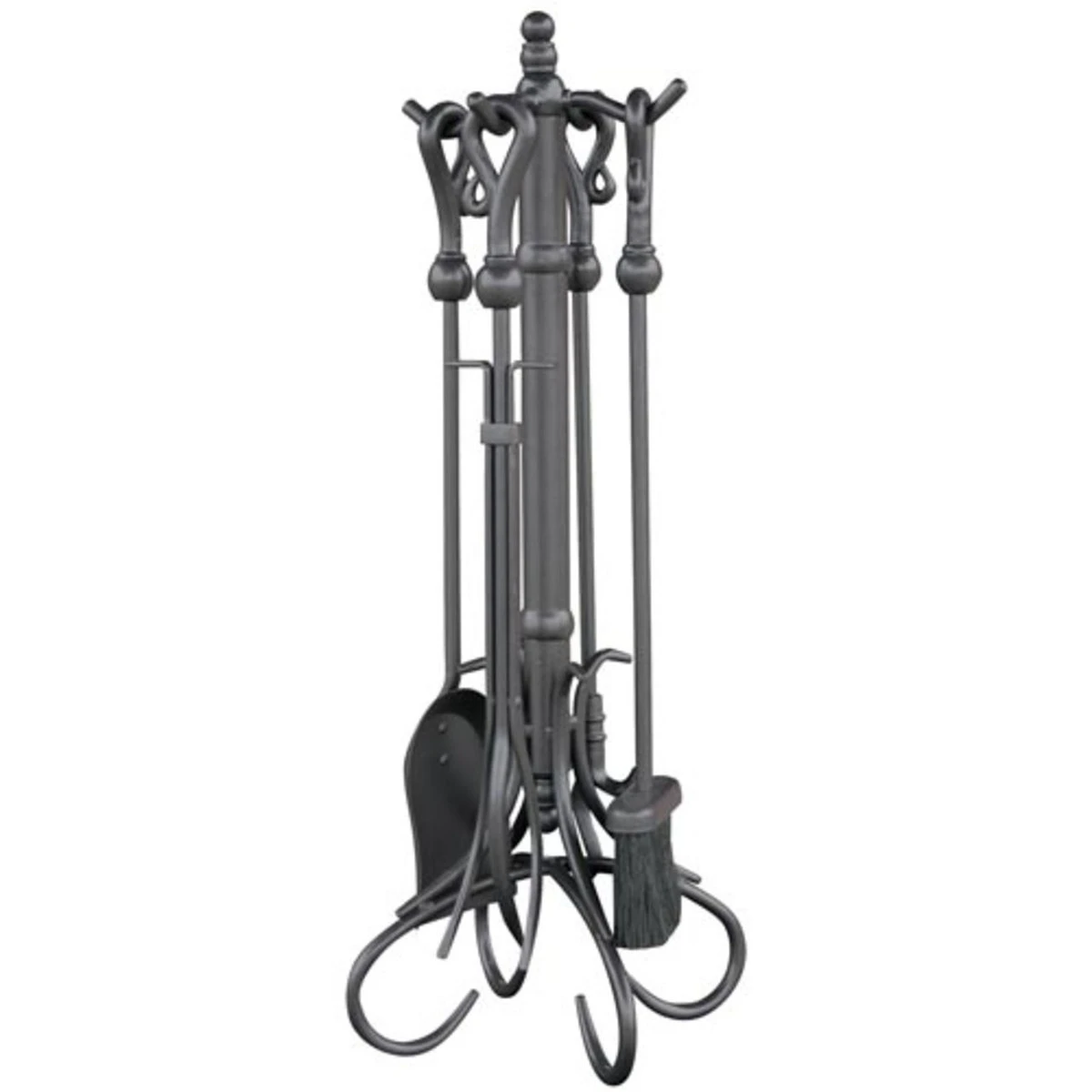 This Five Piece Olde World Iron Fireset with Heavy Crook Handles consists of everything that you need to keep your fireplace or wood stove clean and in top shape while adding a touch of style to your hearth as well. It’s made of durable wrought iron and has an olde world iron finish for years of dependable use. This fireplace set includes the stand, a poker, shovel, tongs, and a brush. Measures 30″ high.