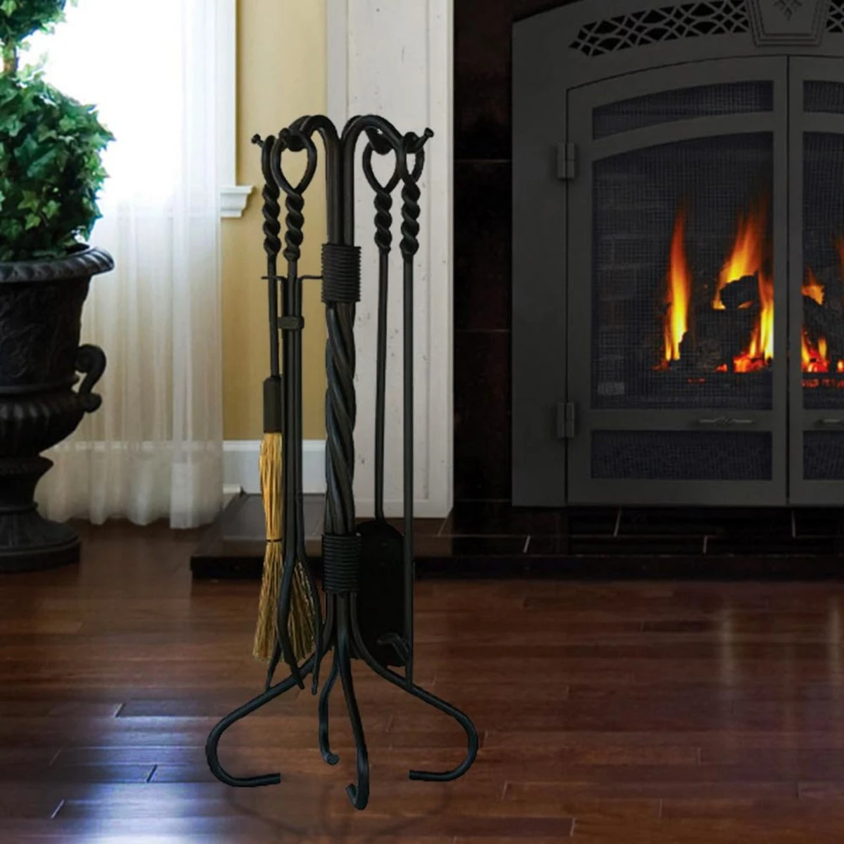- Set includes a broom, poker, shovel, tongs and tool stand