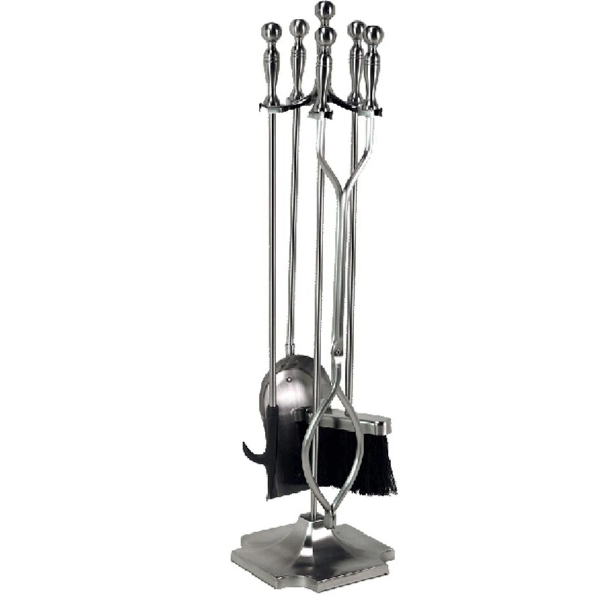 This pewter fire tool set features a handsome ball handle design in a beautiful pewter finish. It’s the practical hearth accessory that will keep your fireplace looking its best while adding a beautiful decorative accent to your hearth. Fire tool set includes the brush, poker, shovel tong and stand. Measures 30 1/2″ High.