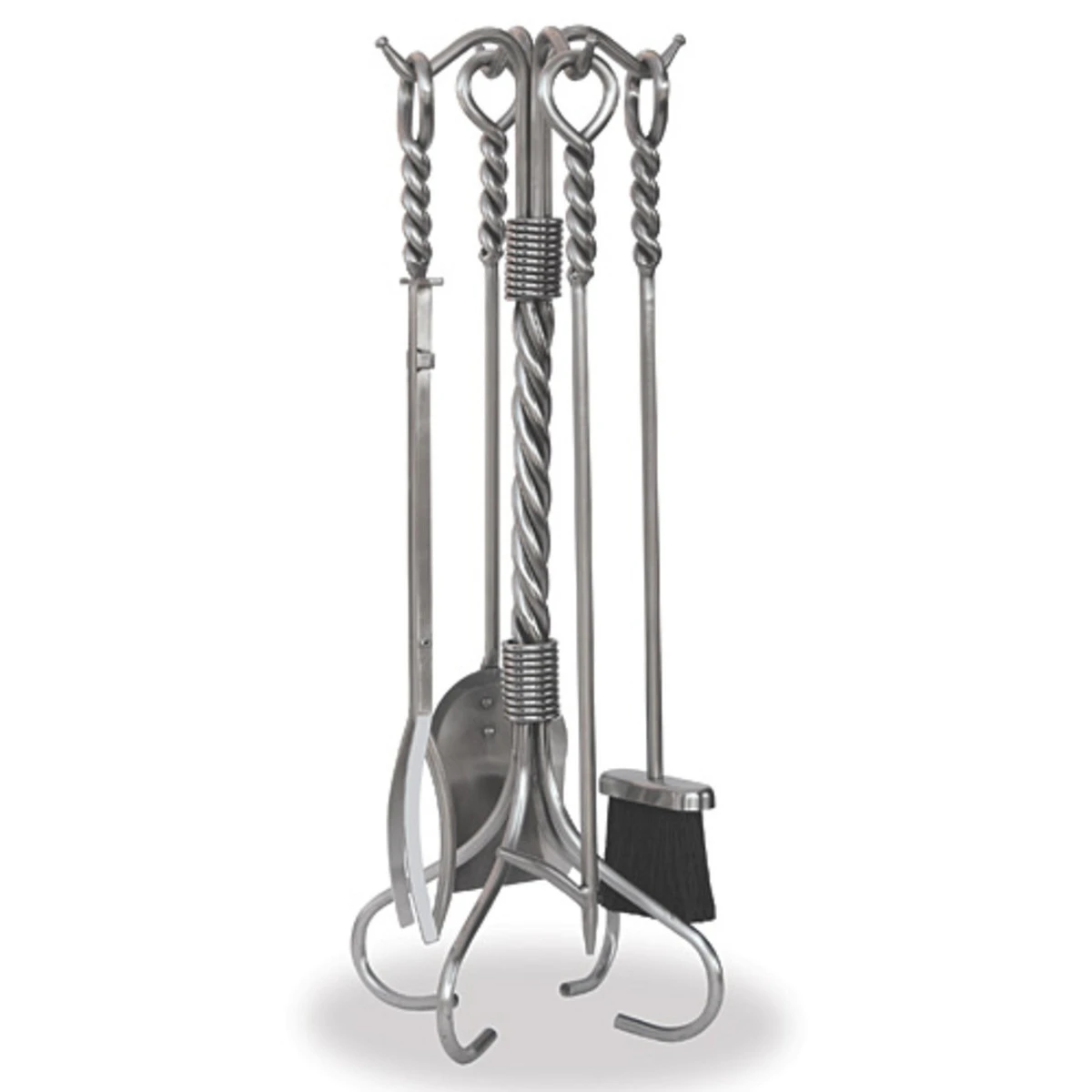 The attractive design isn’t the only twist this Stainless Steel Fireplace Tool Set has to offer. Constructed from durable 304 stainless steel, it is sure to be a great addition to your fireplace collection. This five piece tool set is gathered in a twisted stainless steel holder with a claw shaped base. The top of the tool set features uncluttered hooks and easily stores the shovel, broom, poker, and log tongs. Each tool has a twisted looped handle for comfortable grip and convenient hanging. Measures 30″ High.