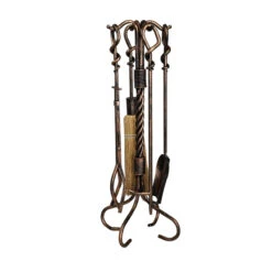 Keep your hearth looking its best with this handy Fireplace Tool Set. These fire tools feature a hand-forged wrought iron twist design on each tool and at the center of the stand. It’s coated with an antique rust finish that will look great on most any hearth. Set includes a shovel, poker, tongs, brush and tool stand. Measures 30″ High.