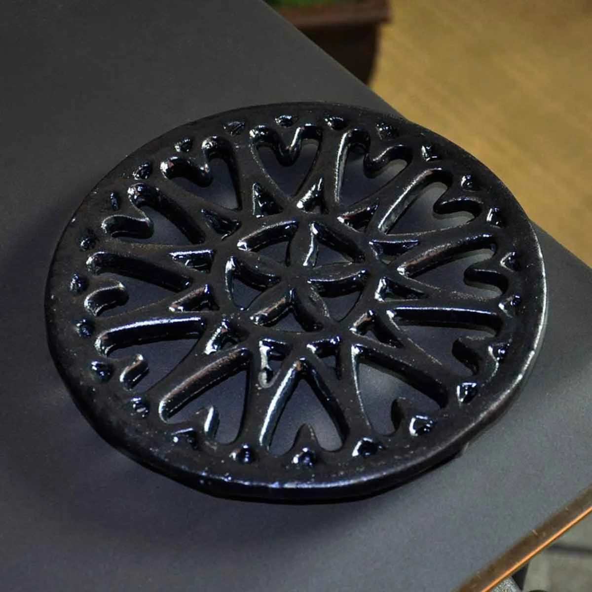 Product Note: Trivet may be shipped with rubber boots on the legs for protection. These will need to be removed before placing the trivet on your wood stove so that they do not melt and cause damage to your stove.