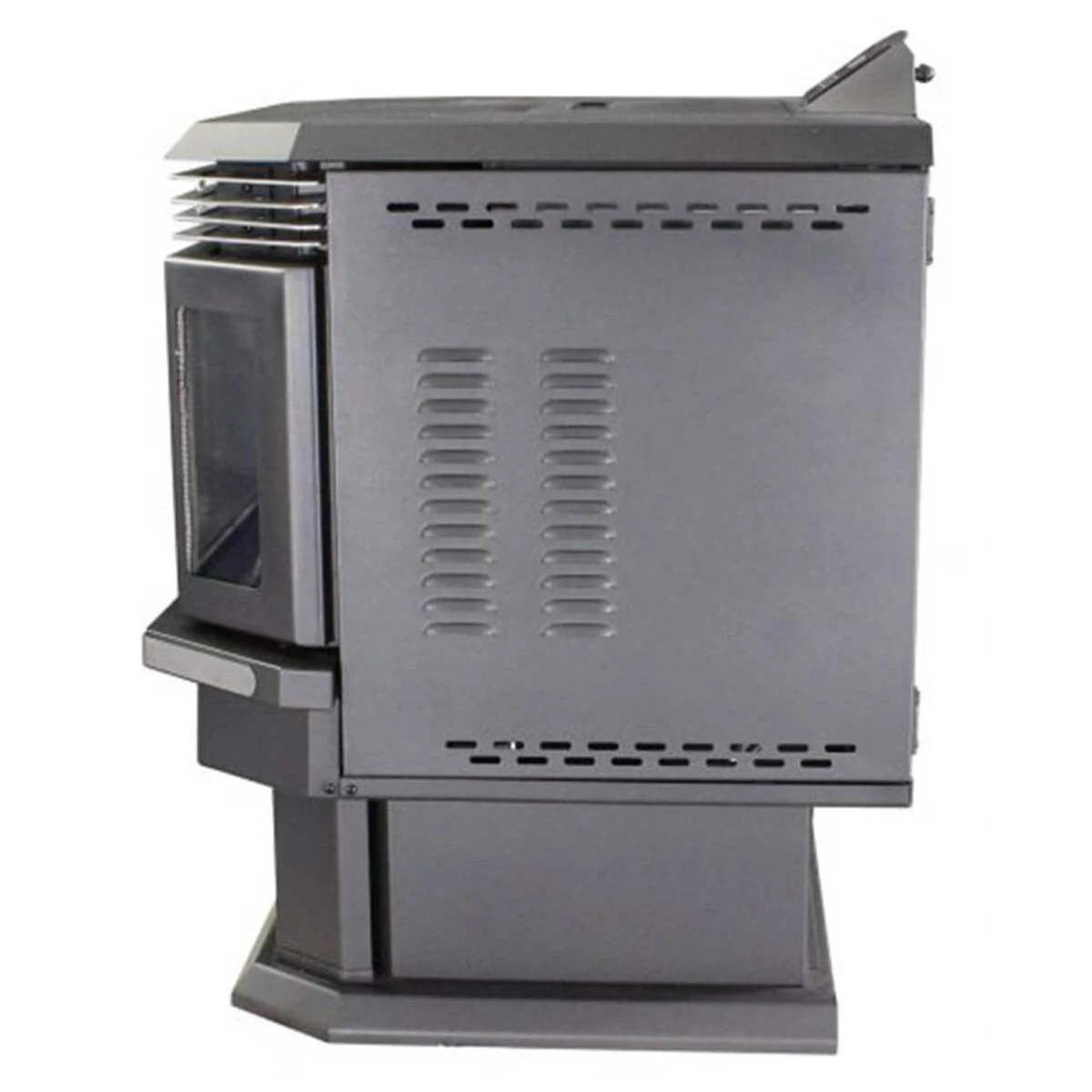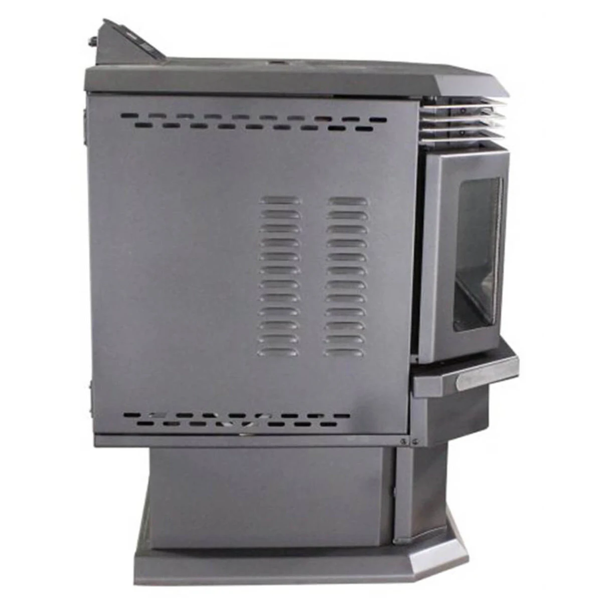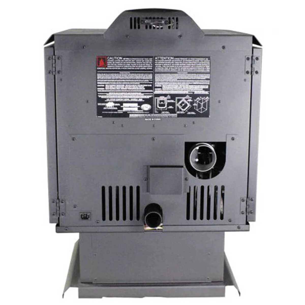 The Ashley Bayfront Pellet Stove with 40 lb Hopper – AP5660 is a fully automatic pellet stove with auto ignition and easy to use electronic controls. Setting this pellet heater apart is the wide bay front glass design that gives you a wonderful view of the fire. To add to its charming character, the stove also has a faux log set and brick fireplace backer giving you the look of a traditional fireplace. It utilizes a temperature control circulation blower to spread heat evenly it is a durable yet sleek design, built for years of high performance. The Ashley Bayfront Pellet Stove with 40 lb Hopper – AP5660 blends nicely with any room setting and provides your home with the desired warmth even in the coldest of climates. Pellet heaters work by using a software driven control board to precisely deliver a pre-determined amount of fuel from the hopper into a burn chamber. An electric heating element, used only in startup, heats the pellets until they ignite. The combustion blower forces air through the burn chamber and once ignited, it provides an active combustion of the pellets resulting in very little ash. The exhaust and heat pass through one side of air chambers where on the other side, the variable speed room blower gathers the heat and distributes this through the room. This entire process results in a very clean burning, efficient heating machine for your home.