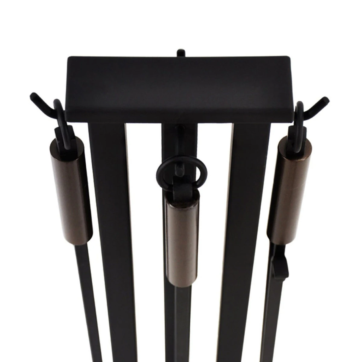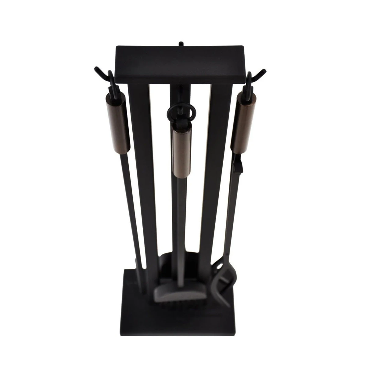 Pilgrim’s Contemporary Black Fireplace Tool Set offers a tasteful design for both traditional and more modern styled hearths. Four sturdy fireplace tools hang neatly from an inline cast iron stand. Sharp burnished bronze handles add just a hint of flare to this simple set. It’s a great look to add to any hearth. Set includes the stand, a poker, brush, shovel and log tongs. Measures 32″ High.