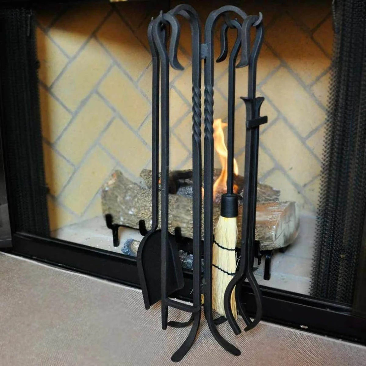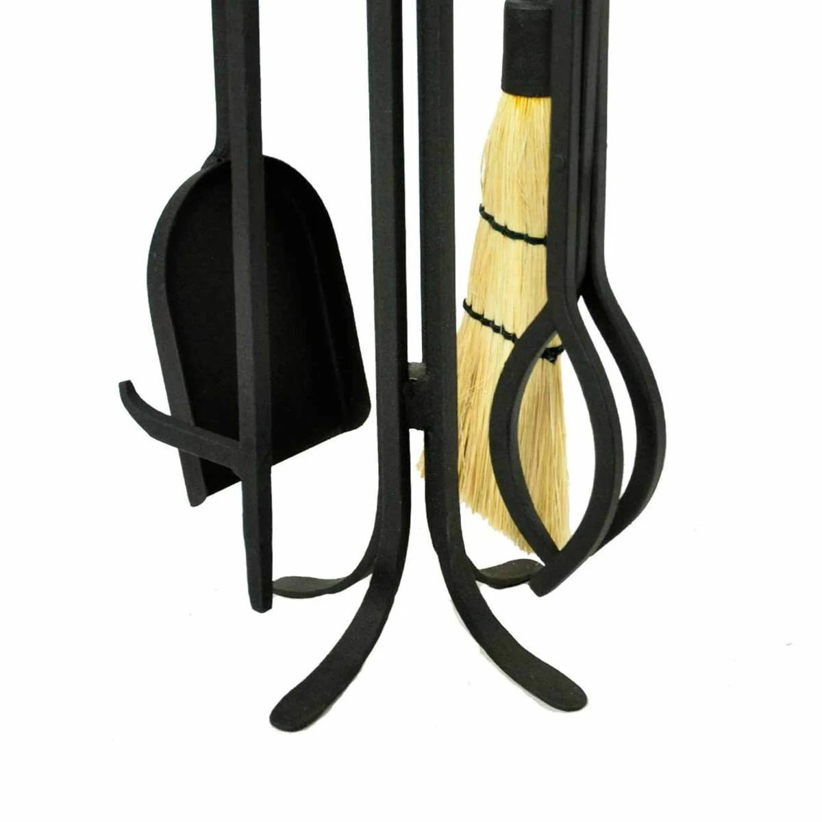 The Shepard’s Hook design is always a popular choice in fireplace tool sets. Add it to your fireplace accessories today and enjoy years of faithful quality service. This set is ruggedly constructed of durable wrought iron and has a black powdercoat finish for beauty you can count on to last for years. Set includes the stand, a broom, poker, shovel, and tongs. Measures 26″ High.