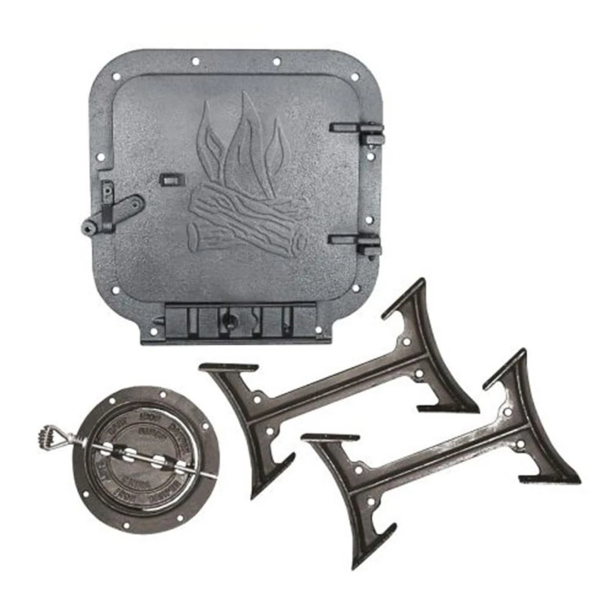 - Includes feed door, legs, installation hardware, 6″ flue with damper